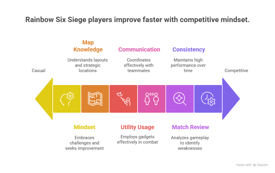 Competitive Rainbow Six Siege players improve faster because they approach the game with structure, discipline, and reflection. They learn from data, adapt strategies, and control emotions.